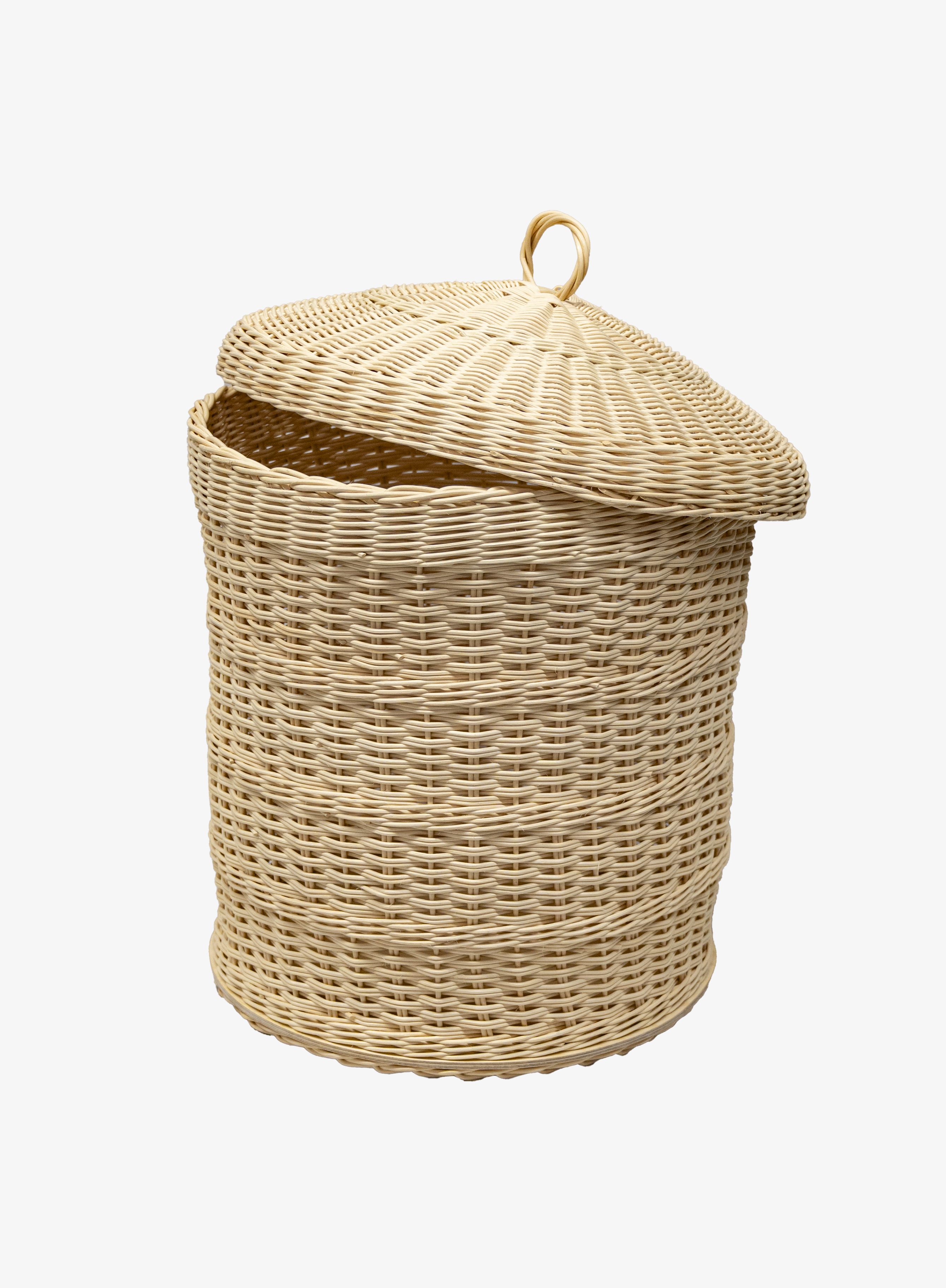 Kaunis ydinrottingista kudottu kannellinen kori likapyykille. Pohja koivuvaneria; kori on lakattu vesiohenteisella lakalla. Korin halkaisija n. 40 cm x korkeus n. 50 cm; korkeus kannen kanssa n. 60 cm. (Kuvassa kori 40x45 cm)